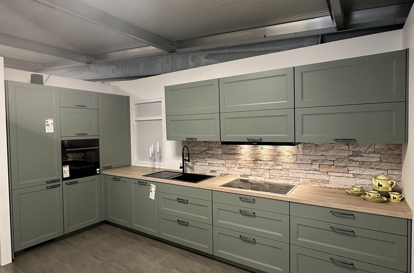 Eine Landhausküche mit gemütlichem Charme. Die Rahmenfronten im Programm Cascada verleihen der Küche eine klassische und zugleich moderne Ausstrahlung. Das sanfte Schilfgrün sorgt für eine harmonische, natürliche Atmosphäre, während die dunklen Griffe stilvolle Akzente setzen. Die helle Holzarbeitsplatte rundet das Design perfekt ab und bringt Wärme in den Raum.