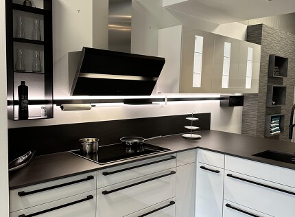 Moderne weiße L-Küche mit tollen schwarzen Akzenten