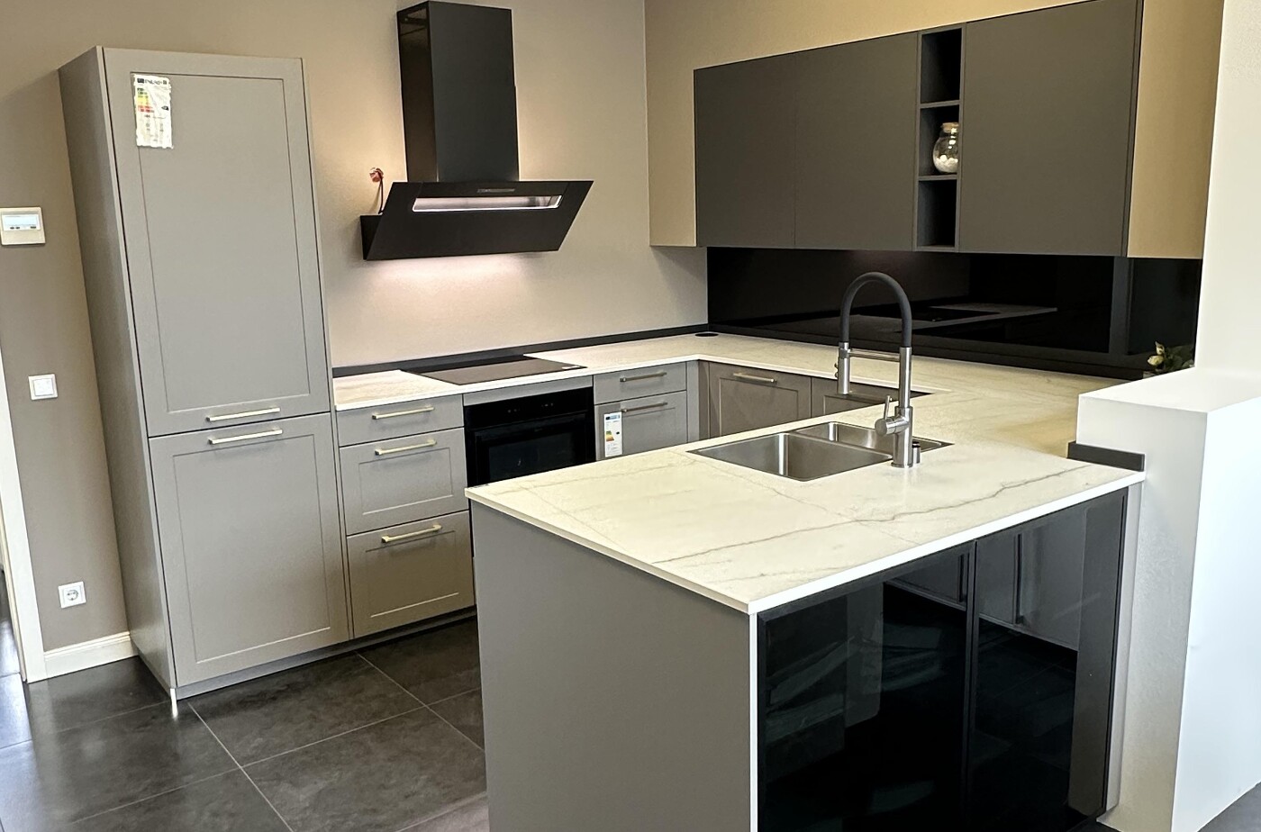 Diese stilvolle grifflose Küche in L-Form mit Insel beeindruckt mit schwarzen Antifingerprint-Fronten und einer edlen Keramikarbeitsplatte. Ausgestattet mit einem Neff Kochfeldabzug, LED-beleuchteten Griffleisten und beleuchteten Glasschränken, verbindet sie modernes Design mit funktionalem Komfort auf höchstem NiveauEhemaliger eigener Verkaufspreis 34.670 €